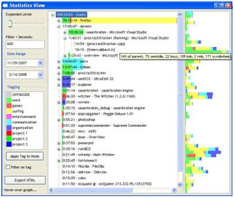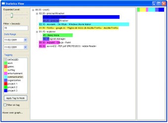 Al hacer doble clic sobre su icono, ProcrastiTracker abrirá el panel de estadísticas, donde cada programa se muestra en un árbol jerárquico junto a una barra que muestra el tiempo de uso. A estas barras puedes asignarle un color y una etiqueta asociada para distinguirlas fácilmente.
